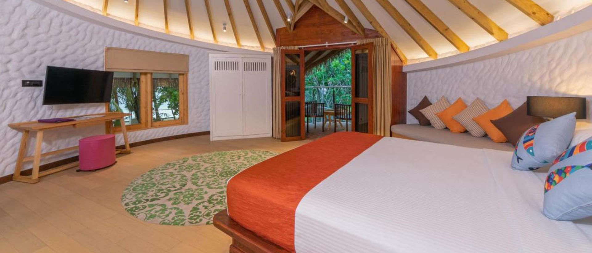 Бунгало на пляже с панорамным видом на океан. В номерах данного типа дети до 2 лет размещаются в детской кровати бесплатно, но взимается городской налог в размере $8 за одного ребенка в сутки. Дети от 2 до 12 лет размещаются на дополнительной кровати бесплатно, но за каждого из них будет взиматься дополнительная плата за питание в размере 25% от стоимости номера. Стоимость проживания не включает трансферы на катере от и до курортного отеля. Пожалуйста, ознакомьтесь с разделом "Важная информация" ниже для получения информации о ценах.